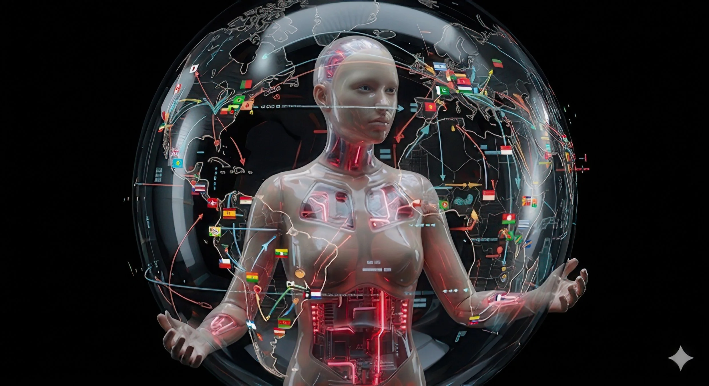 The image's primary tension lies in how it visualizes the source of the robot’s intelligence. It powerfully challenges the idea that "intelligence" is a singular, internal, or contained property. The complex web of data lines and national flags clearly signals that the information driving this figure is global—a non-localized, decentered product. This visualizes a crucial critical point about the "globalization of AI": its intelligence is a product of data harvested from countless diverse cultures, languages, and jurisdictions.